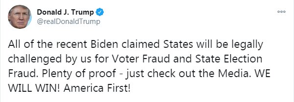 نامزد حزب جمهوریخواهان در یادداشت توئیتری دیگر، تمام برگههای برنده بایدن را زیر سوال برد و گفت: تمام ادعای اخیر بایدن در بردن ایالتها از نظر تقلب رایدهندگان و شیادی انتخابات ایالتی با چالش حقوقی ما مواجه خواهند شد.