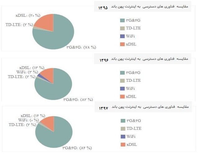 در حال حاضر به نظر میرسد با گذشت زمان، اینترنت نسلهای سه و چهار اینترنتی در مقایسه با دیگر انواع اینترنت، رشد بیشتری دارند. همانطور که از سال ۱۳۹۵ استفاده از اینترنت پهنباند DSL و TD-LTE کاهش یافته و اینترنت نسل سه و چهار از ۷۸ درصد در سال ۹۵، به ۸۲ درصد در سال گذشته و اکنون به ۸۴ درصد رسیده است.
