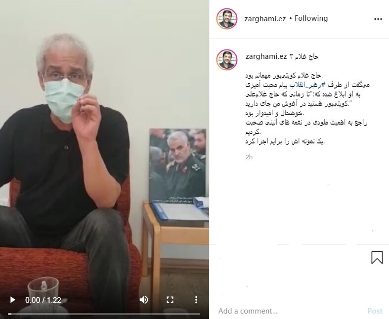 به گزارش همشهری آنلاین، عزت الله ضرغامی در حساب کاربری اش در اینستاگرام نوشت: «حاج غلام کویتی‌پور مهمانم بود. می‌گفت از طرف رهبر انقلاب پیام محبت آمیزی به او ابلاغ شده که: «تا زمانی که حاج غلام‌علی کویتی‌پور هستید در آغوش من جای دارید.»