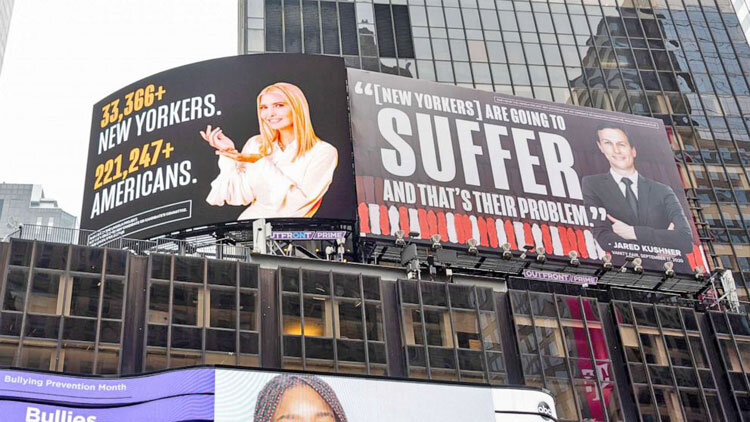 به گزارش همشهری آنلاین به نقل از گاردین، نصب دو آگهی غولپیکر در میدان تایمز نیویورک با موضوع شیوه مدیریت بیماری کرونا در دولت دانلد ترامپ و آمار بالای قربانیان کووید-۱۹ در ایالت و شهر نیویورک در روزهای اخیر خبرساز شده است. در این آگهیها، ایوانکا و همسرش کوشنر با آمار و ارقام به تعداد زیاد قربانیان کرونا در نیویورک اشاره میکنند و آن را مشکل خود شهروندان نیویورکی میدانند. در فاصله کمتر از ۱۰ روز تا انتخابات ریاست جمهوری، این آگهیها میتواند وجهه رئیس جمهوری آمریکا را در یکی از مهمترین شهرهای ایالات متحده بدتر از گذشته کند.