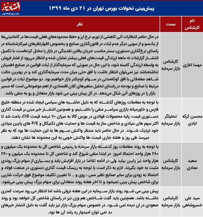 برخی دیگر تاکید دارند: با توجه به روند معاملات روز گذشته بازار سرمایه با رسیدن شاخص کل به محدوده یک میلیون و ۲۸۰ هزار واحد احتمالا امروز در ابتدا منفی شروع کند و شاخص کل تا محدوده یک میلیون و ۲۶۰ هزار واحد نیز پایین بیاید ولی در ادامه تقاضا در بازار افزایش یابد و بسیاری از سهام بزرگ روندی مثبت به خود بگیرند.