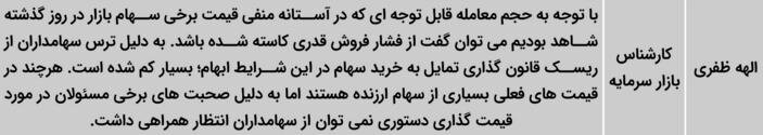 برخی تحلیلگران تاکید میکنند: با توجه به معاملات روزهای گذشته که به دلیل حاشیه های سیاسی ایجادشده در منطقه خلیج فارس و خاورمیانه بازاری سراسر منفی داشتیم و همچنین انتشار خبر مبنی بر قیمت گذاری دستوری قیمت پایه محصولات فولادی در بورس کالا به میزان ۷۰ درصد قیمت CIS، باعث شد اکثر سهمهای بنیادی و شاخصساز به قیمت ها و حمایت های تکنیکال و P/E های پایین بنیادی خود نزدیک شوند. در حال حاضر باید منتظر واکنش سهم ها به این حمایت ها بود که به نظر میرسد طی روز و هفته جاری قیمت ها واکنش خوبی به این محدوده ها نشان دهند.