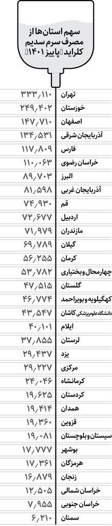 به گزارش همشهری آنلاین، ماهانه ۱۹میلیون سرم در کشور تأمین میشود و آمار اعلام شده ازسوی سازمان غذا و دارو نشان میدهد که در پاییز امسال تهرانیها بیشترین مصرف سرم را داشتهاند. خوزستان و اصفهان در ردههای بعدی قرار دارند و در انتهای جدول هم نام سمنان و خراسانهای شمالی و جنوبی بهعنوان کممصرفها آمده است؛ سرمهایی که کمبودشان از شهریور امسال، منجر به اقدامات جدی از سوی سازمان غذا و دارو برای افزایش تولید و واردات شد.