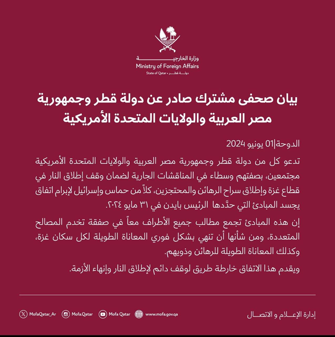 به گزارش همشهری آنلاین به نقل از دانشجو، دولت قطر، جمهوری عربی مصر و ایالات متحده آمریکا از کلیه طرف ها دعوت میکند که تضمین کننده اجرای طرح آتش بس در باریکه غزه و آزادی اسرا از سوی حماس و اسرائیل که توسط رئیس جمهور بایدن در تاریخ ۳۱ می پیشنهاد شد، باشند.