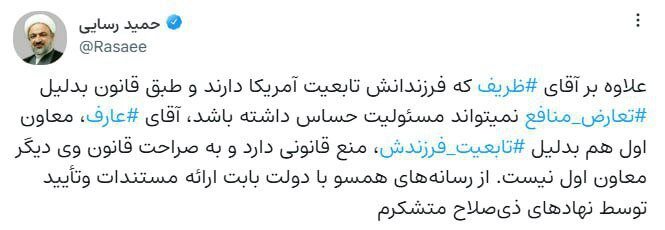 به گزارش همشهری آنلاین حمید رسایی، نماینده تهران در شبکه اجتماعی ایکس نوشت: علاوه بر آقای ظریف که فرزندانش تابعیت آمریکا را دارند و طبق قانون به دلیل تعارض منافع نمیتواند مسئولیت حساس داشته باشد، آقای عارف معاون اول هم به دلیل تابعیت فرزندش منع قانونی دارد و به صراحت قانون وی دیگر معاون اول نیست. از رسانههای همسو با دولت بابت ارائه مستندات و تایید توسط نهادهای ذیصلاح متشکرم!