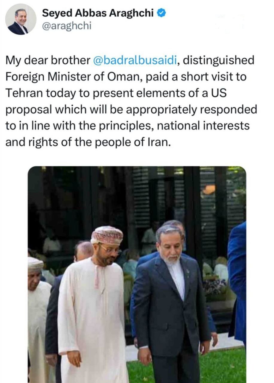 پیام سید عباس عراقچی وزیر امور خارجه در خصوص سفر کوتاه وزیر خارجه عمان به تهران نوشت: برادر عزیزم آقای بدر البوسعیدی، وزیر محترم امور خارجه عمان، امروز در سفر کوتاهی به تهران عناصر پیشنهادی آمریکا را ارائه داد که بر اساس اصول، منافع ملی و حقوق مردم ایران به آن پاسخ مقتضی داده خواهد شد.