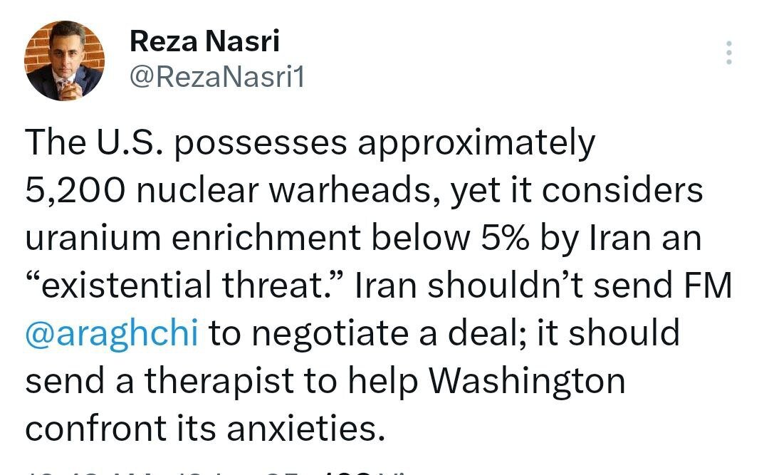 به گزارش همشهری آنلاین رضا نصری نوشت: ایالات متحده حدود ۵۲۰۰ کلاهک هستهای در اختیار دارد، اما غنیسازی اورانیوم زیر ۵ درصد توسط ایران را «تهدیدی وجودی» میداند. ایران نباید وزیر امور خارجهاش، دکتر عراقچی، را برای مذاکره بفرستد؛ باید یک رواندرمانگر بفرستد تا به آمریکا کمک کند با اضطرابهایش کنار بیاید.