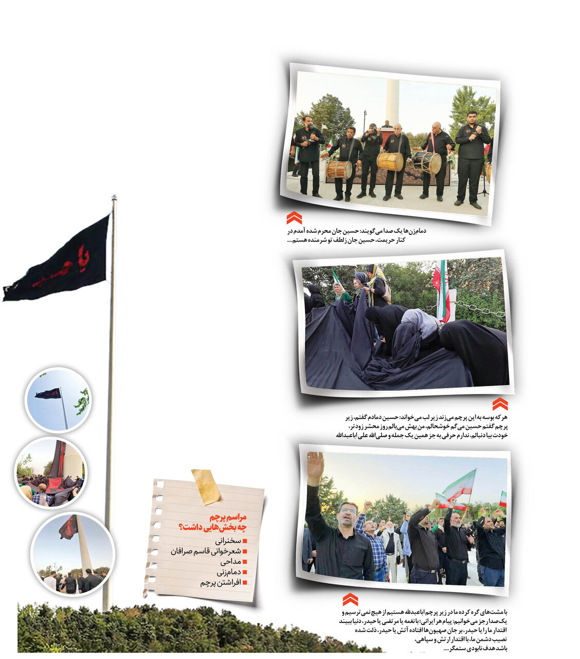 هم اینک دلها حسینی شده و زن و مرد، پیر وجوان با چشمانی نمناک همگی نظارهگر افراشته شدن پرچم میشوند. پرچم منقوش به «یاحسین» با نوای سنج و دمام به اهتزاز درمیآید و مرد جوان میگوید: «آبروی این گدا از آبروی پرچم است» پرچم با ذکر صلوات و مشتهای گره خورده حاضران اندک اندک بالا میرود و بر بلندی پایتخت چشمنوازی میکند. بیرق هزارمتری که تا پایانماه صفر بر فراز بلندترین برج پرچم کشور با ١۵٠متر ارتفاع خواهد ماند.