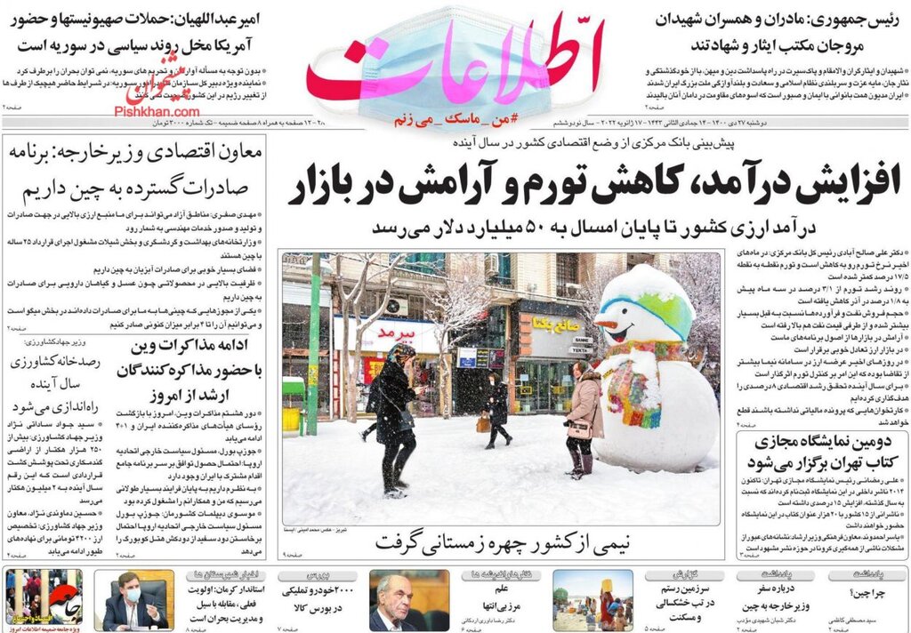 پیام روشن مجلس به تیم اقتصادی دولت، ریشه گران فروشی برنج ایرانی، منوی اقتصادی توافق ۲۵ ساله با چین، حذف ارز ۴۲۰۰ تومانی؛ دهشت زا یا نویدبخش؟ و توافق بی سابقه دشمنان، مهم ترین عناوین روزنامه های ۲۷ دی هستند.