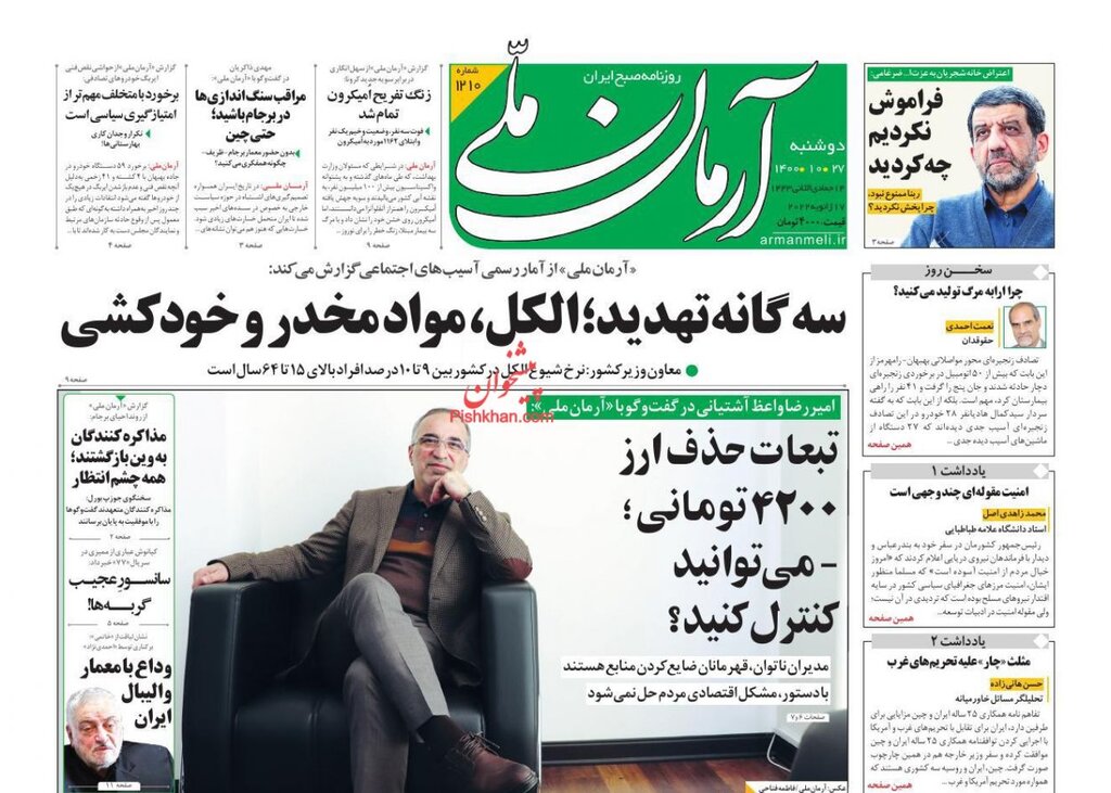 ISSN 1735-6393پیام روشن مجلس به تیم اقتصادی دولت، ریشه گران فروشی برنج ایرانی، منوی اقتصادی توافق ۲۵ ساله با چین، حذف ارز ۴۲۰۰ تومانی؛ دهشت زا یا نویدبخش؟ و توافق بی سابقه دشمنان، مهم ترین عناوین روزنامه های ۲۷ دی هستند.