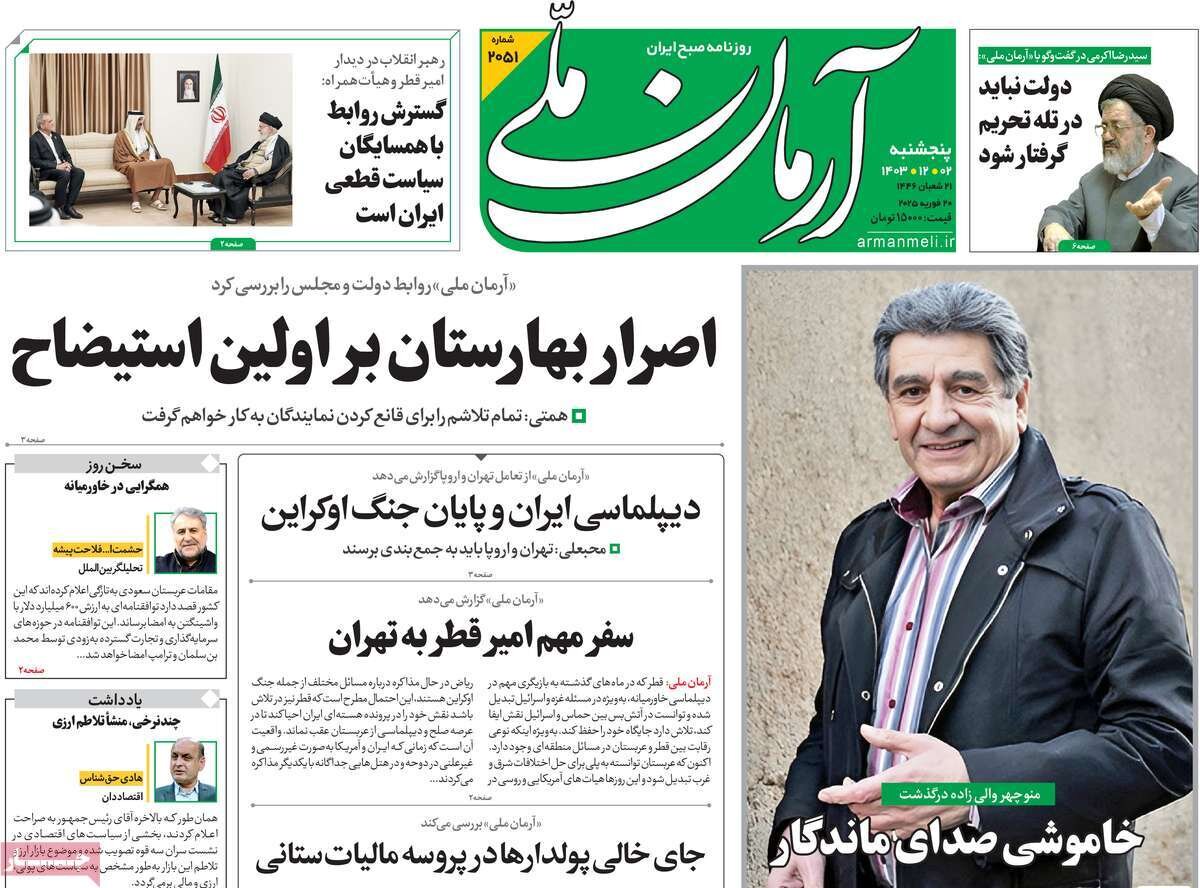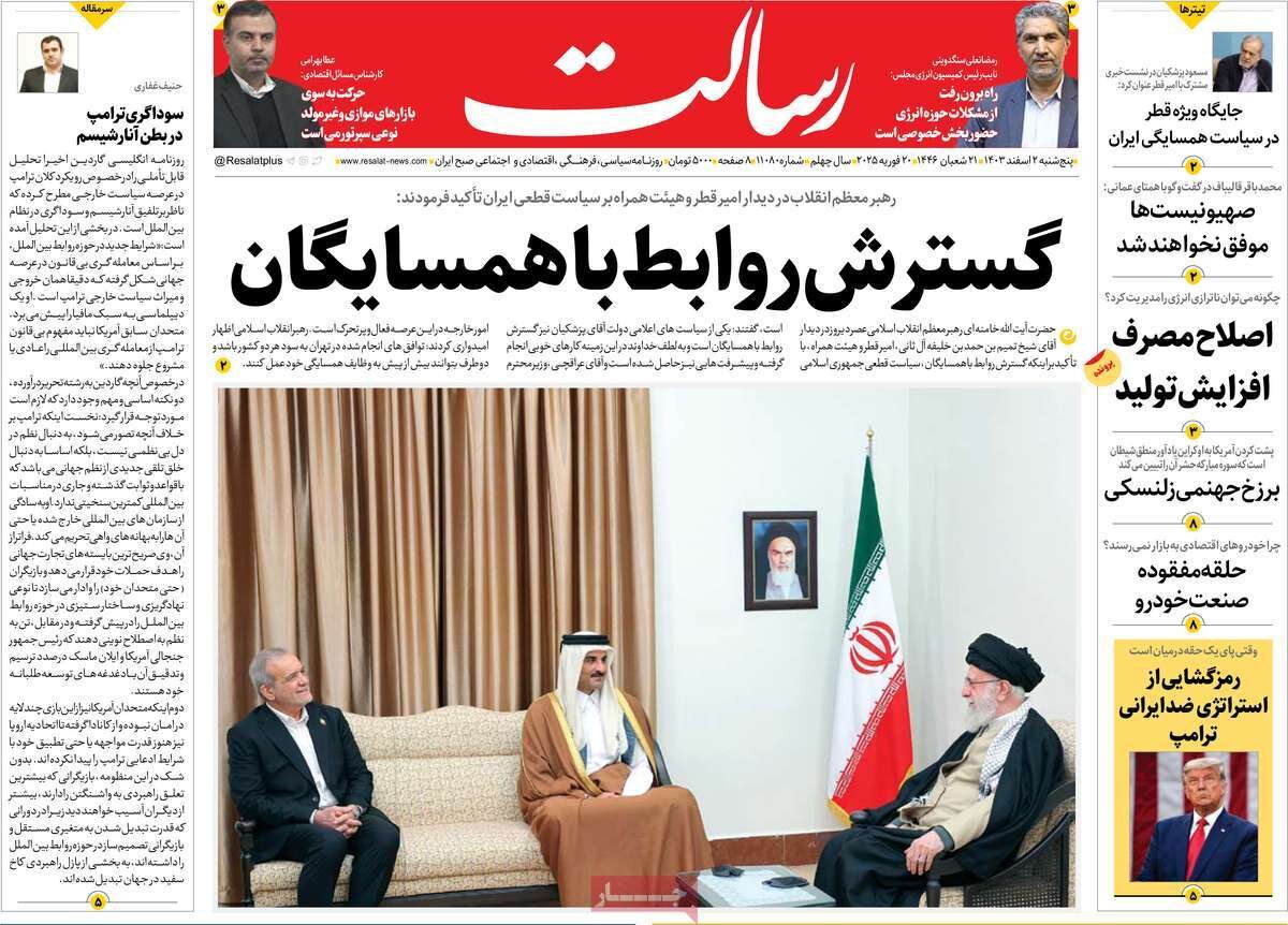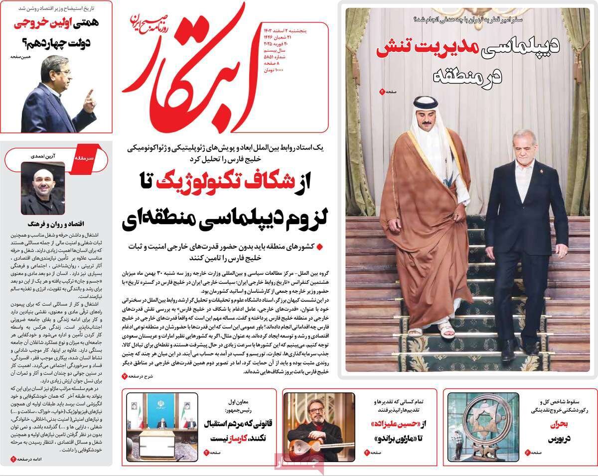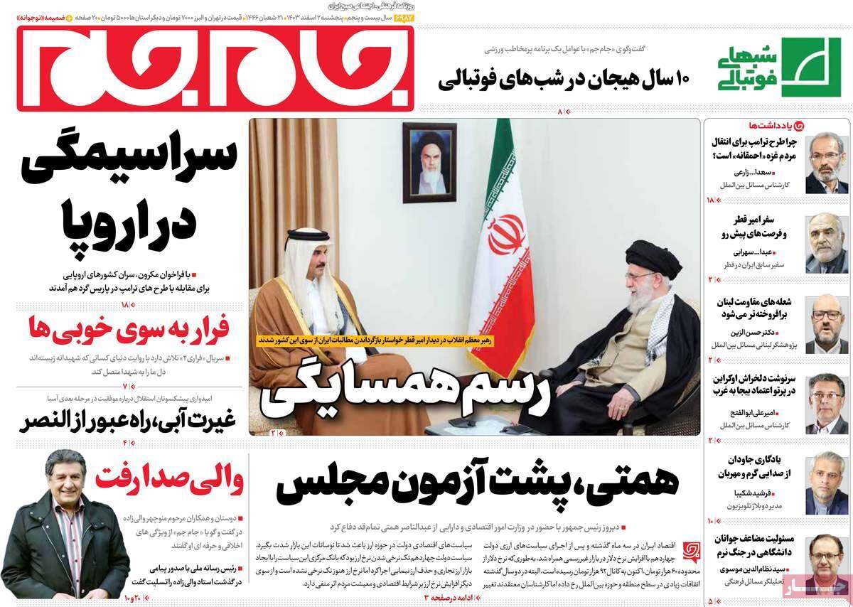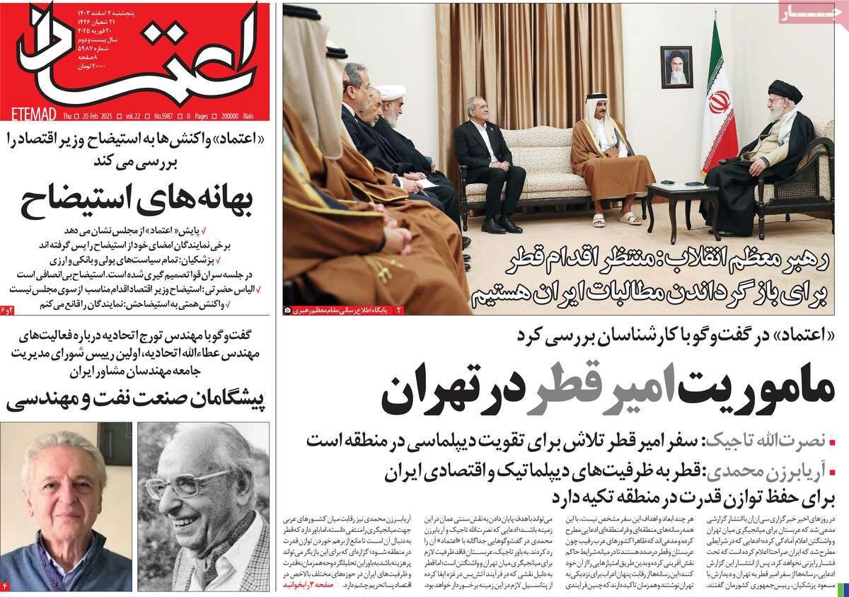دیدار امیرقطر با رهبر انقلاب و رئیس جمهور، جدیتر شدن استیضاح وزیر اقتصاد و... از تیترهای مطبوعات امروز است.