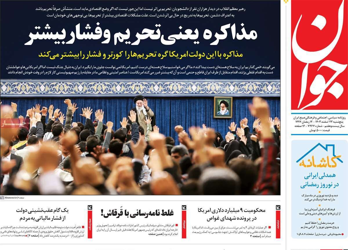 سخنان رهبری درباره مذاکره، دریافت نامه رئیسجمهور آمریکا، واکنشها به تندرویهای انجام شده در موضوع قانون حجاب و... از تیترهای مطبوعات امروز است.