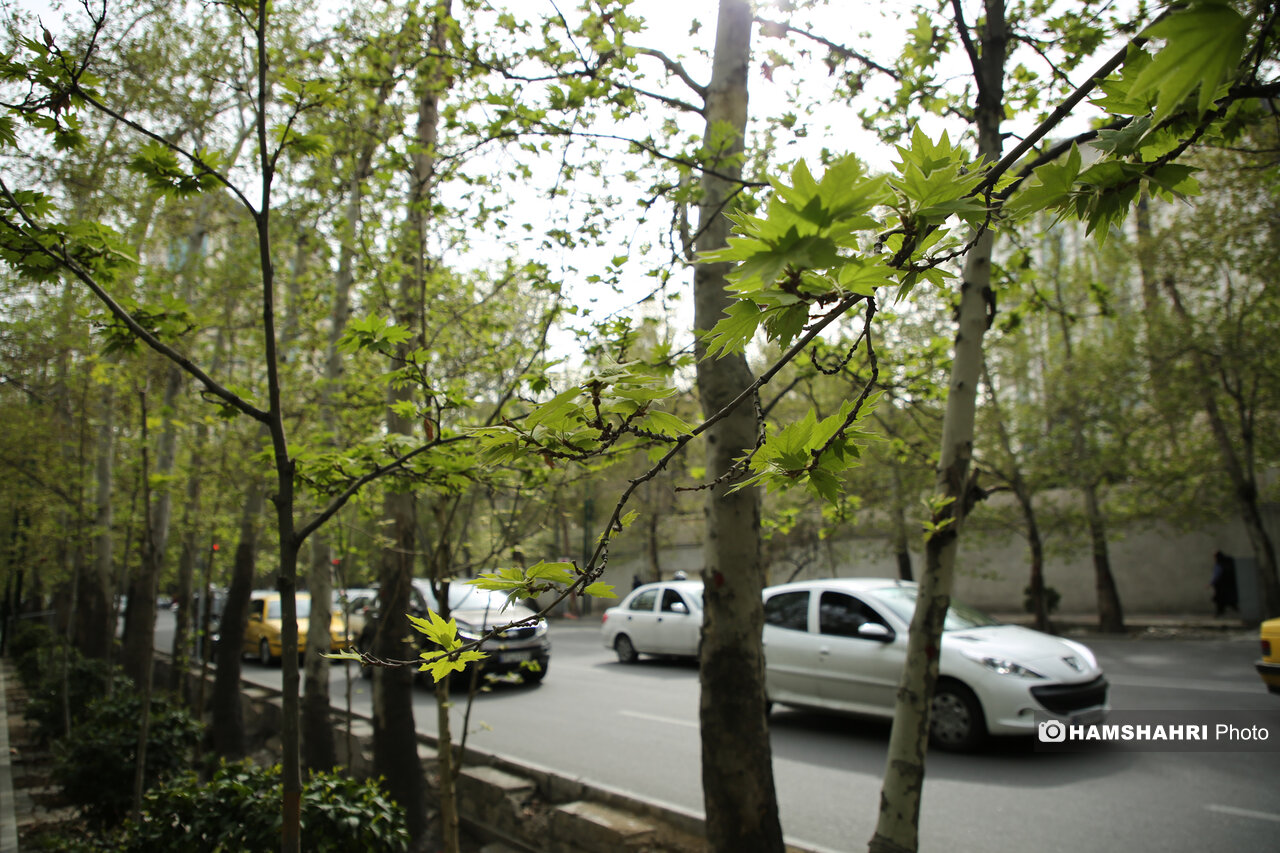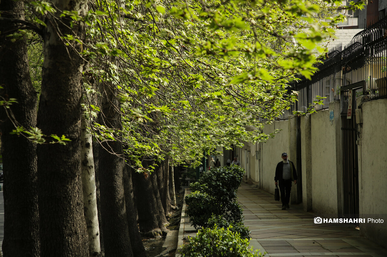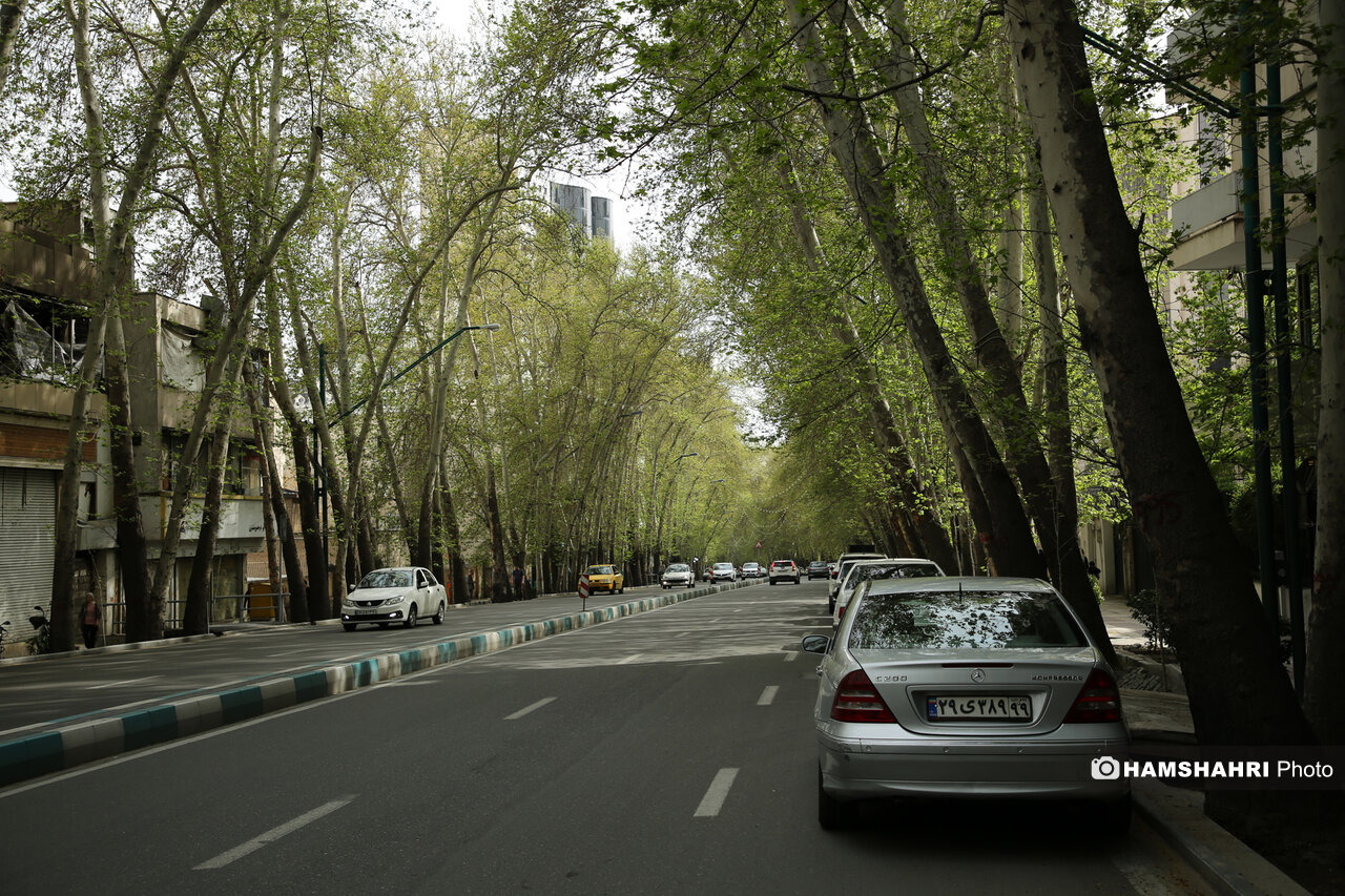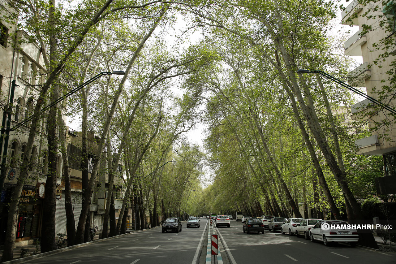 تصاویری زیبا از درختان سبز ولیعصر و حال و هوای بهاری تهران، اینروزها هوای تهران مطبوع و خیابانها آرام است.
