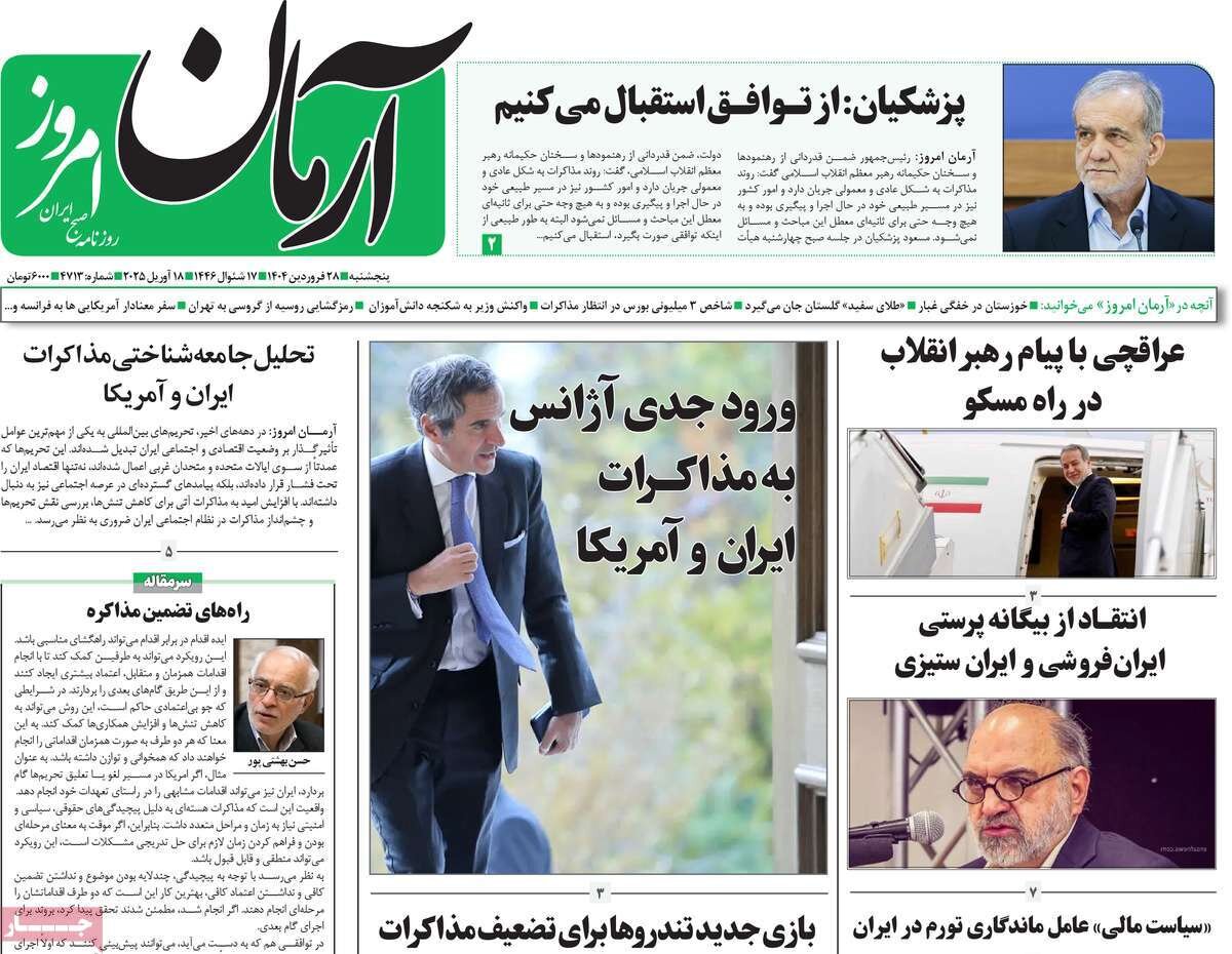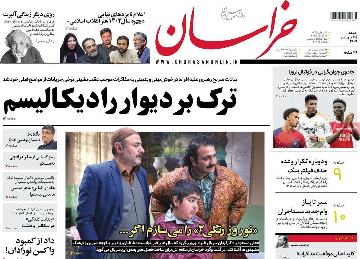 تصاویر | صفحه اول روزنامههای پنجشنبه ۲۸ فروردین ۱۴۰۴ | در ستایش خانواده ورود گروسی به تهران و گمانه زنی درباره مذاکرات ایران و آمریکا از تیترهای مطبوعات امروز است. برچسبها روزنامه روزنامه نگاران خبرنگاران همشهری روزنامه روزنامه نگاری دیدگاه خوانندگان امروز باید AFC بازرس بفرستند تا ببینند لیگ ایران به نفع یک تیم خاص مهندسی میشود | گریه زنوزی باعث شد چیزی نخورم مدارس و دانشگاههای این شهرها و استانها یکشنبه ۷ دی ماه ۱۴۰۴ تعطیل شد شکایت پسر وزیر از زنوزی مستند ترانه علیدوستی در بی بی سی ؛ قرابتسازی با گوگوش و عادیسازی بیحجابی خطونشان رسانه سپاه برای چین و روسیه واکنش رضاییان به خط خوردن از لیست استقلال تصاویر دردناک از مسجد امام علی(ع) پس از حمله انتحاری هنگام نماز پر بینندهترین خبر امروز بارش برف و باران در ۲۷ استان | سرمای کم سابقه و یخبندان در ۲۴ استان + اسامی استانها واکنش فوری ایران به تحرک شرورانه و جدید اسرائیل هم اکنون بارش شدید برف در این نطقه از کشور؛ مردم از سفر به این منطقه پرهیز کنند فوری | بهرام بیضایی درگذشت بازیگر محبوب سینمایی مجری تلویزیون شد واکنش رضاییان به خط خوردن از لیست استقلال توریستهای عراقی پراید ایرانی را به دره پرت کردند؟ پوتین تهدیدش را عملی کرد | موشک هسته ای روسیه آماده شلیک شد ما در یک جنگ تمامعیار با آمریکا و اسرائیل و اروپا هستیم؛ این جنگ بدتر از جنگ عراق با ماست | برای تأمین معیشت مردم برنامه ۲۰ بندی داریم جانشین میلاد محمدی مشخص شد نظر شما شما در حال پاسخ به نظر «» هستید. × لغو پاسخ نام ایمیل نظر شما * * لطفا حاصل عبارت را در جعبه متن روبرو وارد کنید ارسال برچسبها روزنامه روزنامه نگاران خبرنگاران همشهری روزنامه روزنامه نگاری ارتباطات رسانه و روزنامهنگاری ۲۸ فروردین ۱۴۰۴ - ۱۵:۳۸ دریافت تصاویر