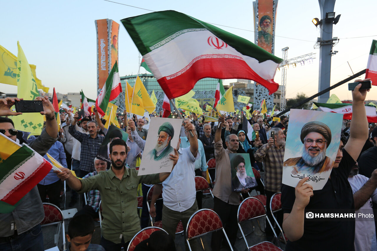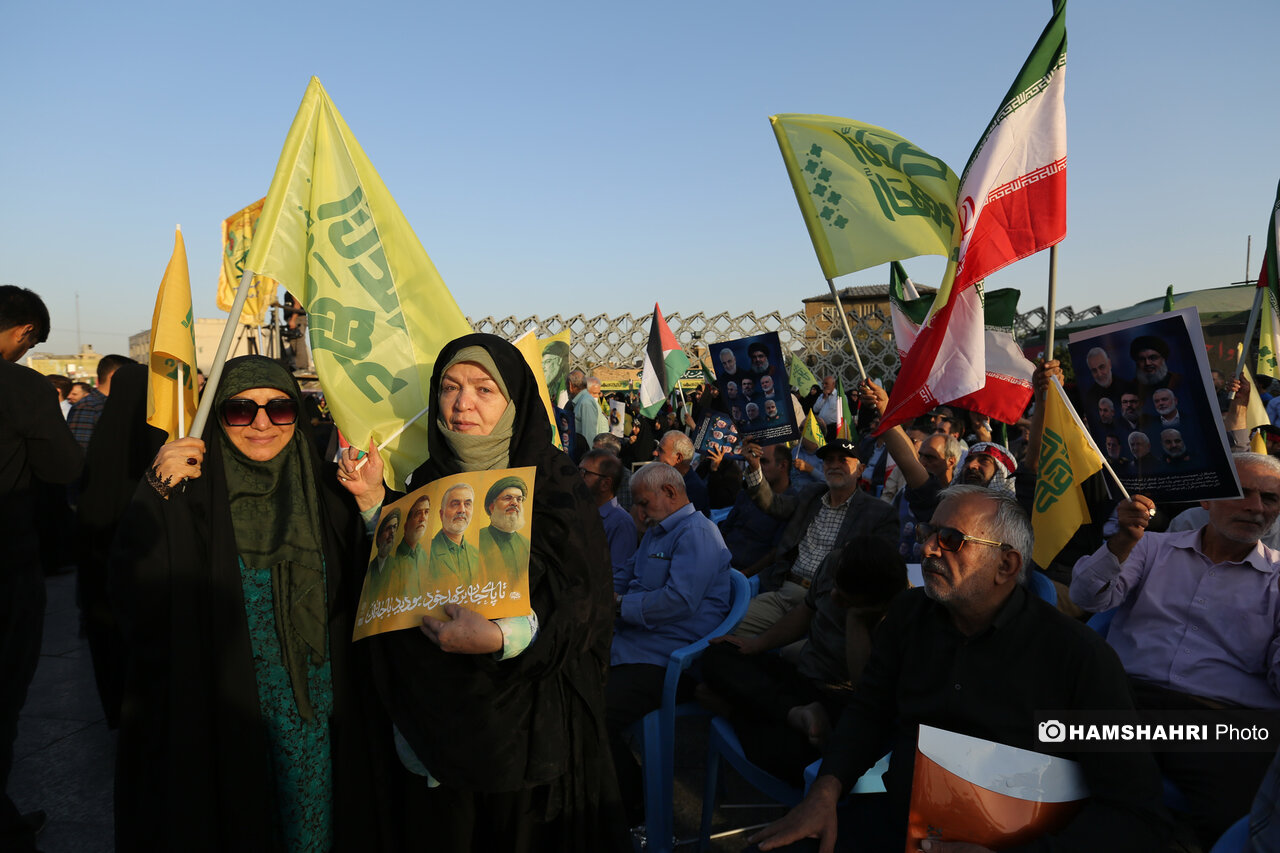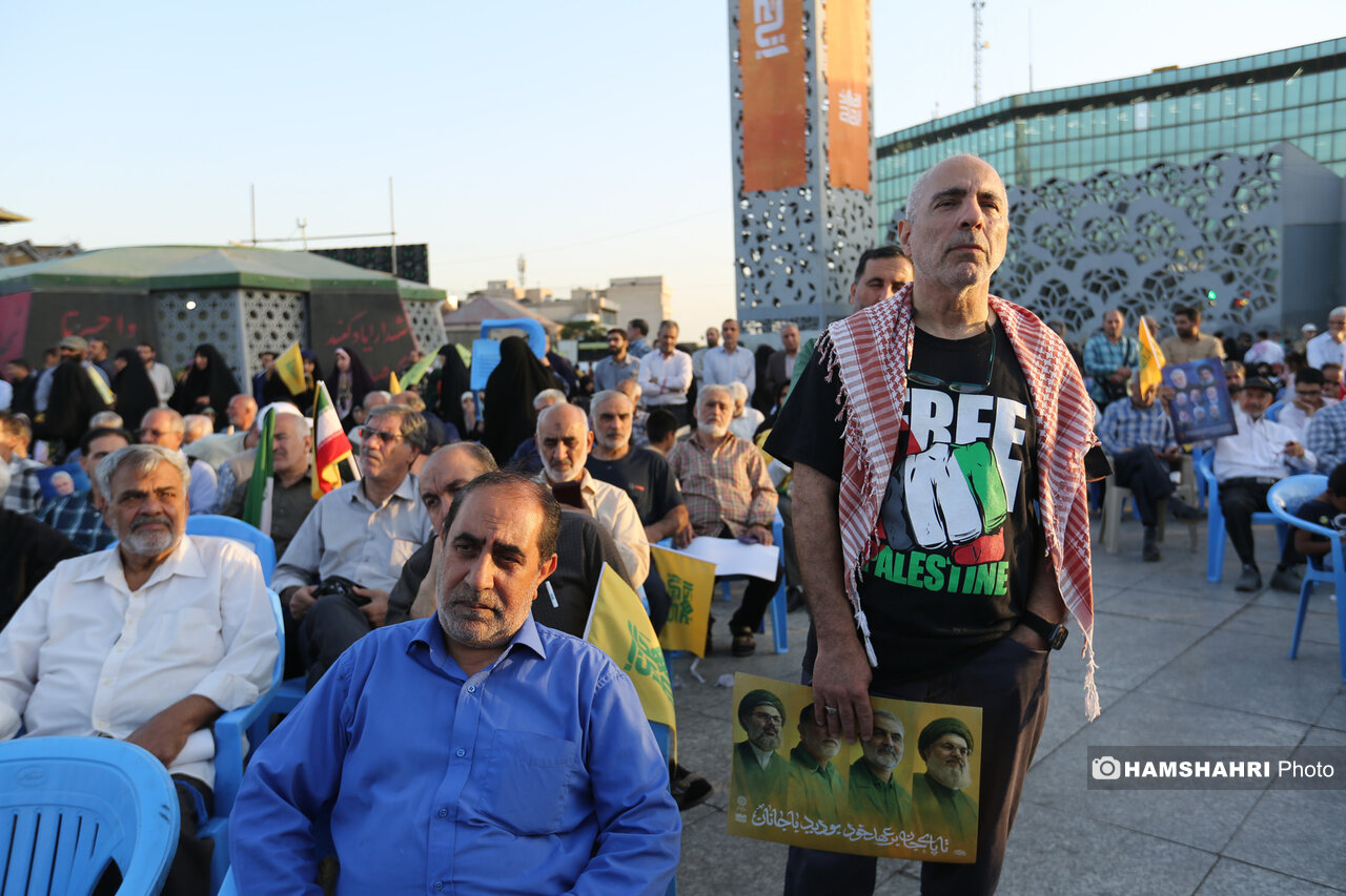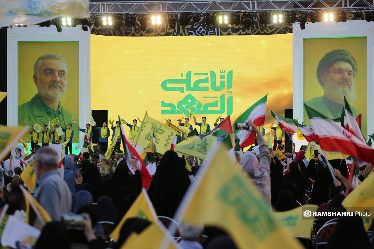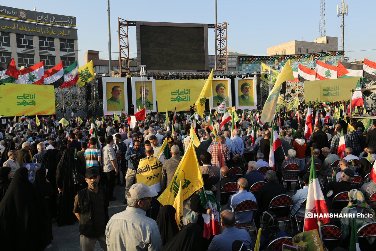 اجتماع مردمی «انا علی العهد» به مناسبت اولین سالگرد شهادت رهبران و فرماندهان مقاومت سید حسن نصرالله، سید هاشم صفی الدین و عباس نیلفروشان بعد از ظهر امروز پنجشنبه ۱۰ مهر ۱۴۰۴ با حضور اقشار مختلف مردم و جمعی از مقامات کشوری و لشگری در میدان امام حسین تهران برگزار شد.